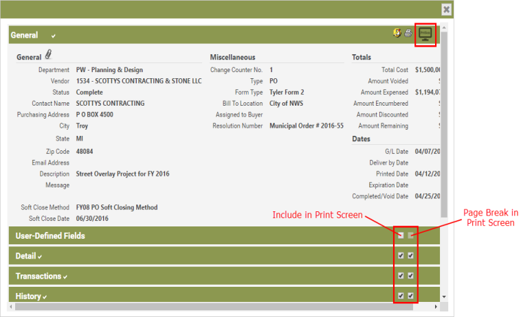 Since PO information within the pop-up is presented in sections of related informational categories, users have the ability to print all sections or selected sections only. Every section title bar includes a set of check boxes (see image below). Selecting the Include in Print Screen check box will include that section in the printout or PDF. Clearing this check box will exclude the section from the print out or PDF.
