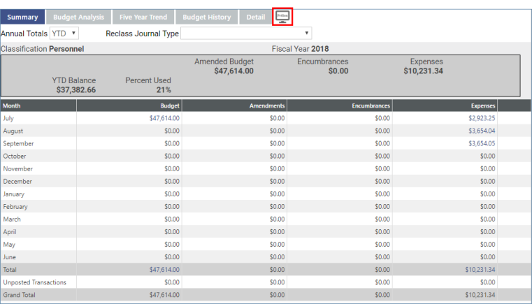 The G/L Account Inquiry page’s Budget History and Detail tabs are exceptions to the rule. Both of these tabs include collapsed information, but the collapsed information is automatically expanded for print screens.