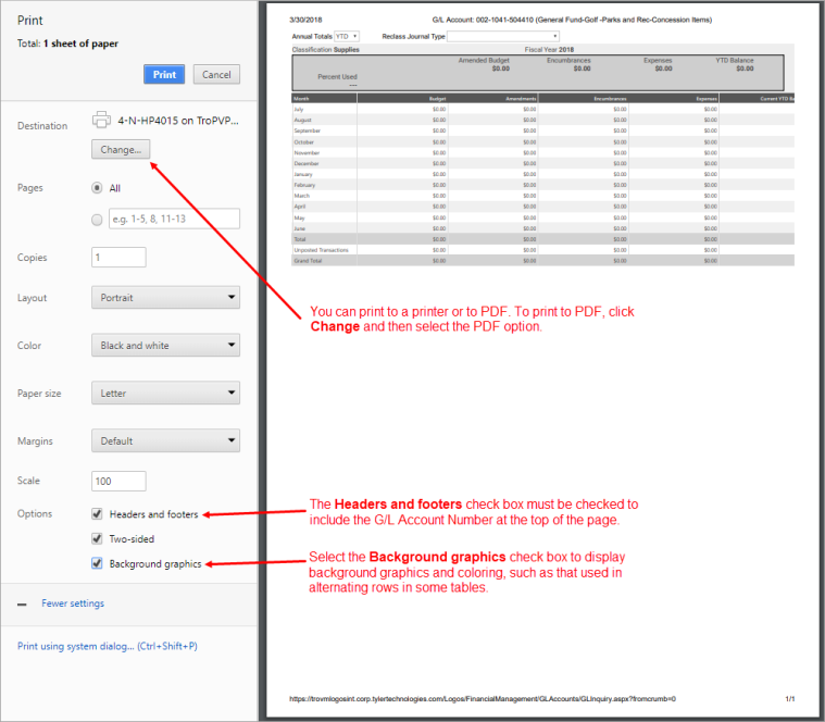 The Print Screen feature works with all major browsers (i.e., Google Chrome, Microsoft Internet Explorer (IE), Firefox, and Safari). However, Tyler recommends using Google Chrome because Chrome offers useful preview and print functionality that the other browsers do not provide.