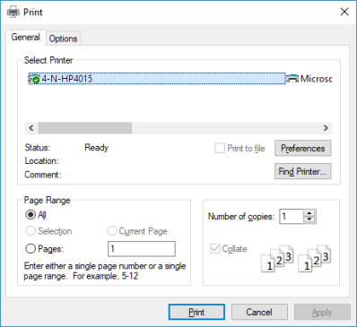 button is available), the Print dialog box will open (see below). This dialog box provides no preview options.