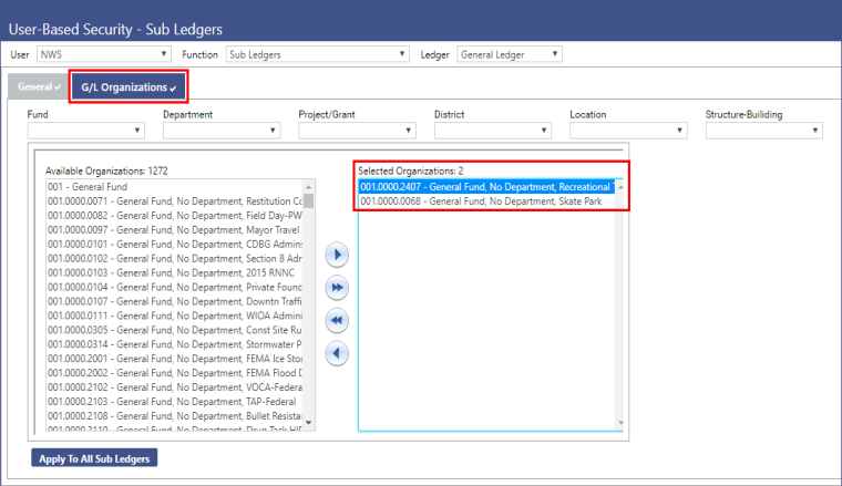 Click Save. Going forward, when the selected user runs a G/L Account Inquiry or G/L Organization Inquiry, the search will return information for only those organizations to which he or she has been authorized. All others will be hidden from view.