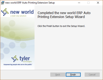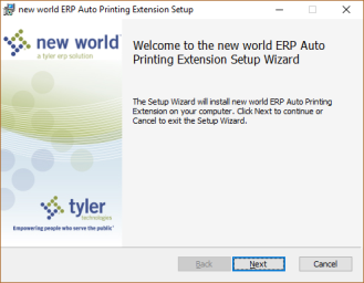 New World ERP Auto Printing Extension Setup Wizard opens. -