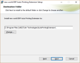 Destination Folder dialog opens. - Accept the default folder for the Auto Printing Extension, or click Change to select a different folder.