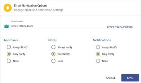 The Email Notification Options panel also provides a link to reset your Tyler Identity (TID) password (RESET TID PASSWORD). Clicking this link opens the
