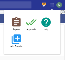 menu with options to navigate to myReports, Approvals and Help Central and an option to add the current page as a favorite.