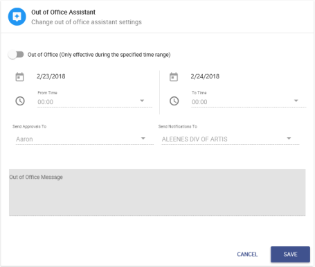 Out of Office Assistant panel to set the date and time range of your absence, select the surrogate(s) who will handle your approvals and notifications and compose the out-of-office message users will receive automatically when sending approvals and notifications to you.