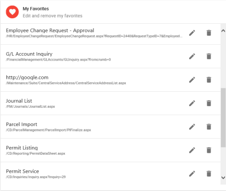 myFavorites panel displays a list of all the pages you have marked as favorites. Page URLs are included.
