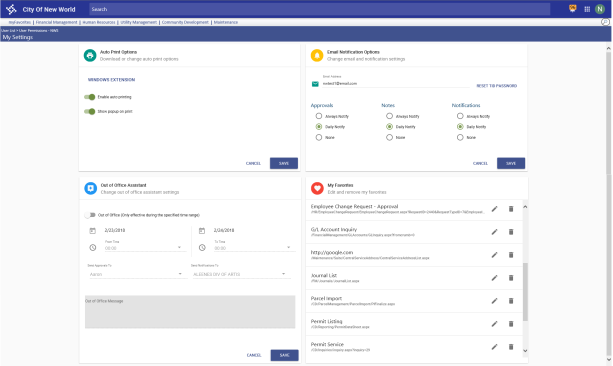 mySettings page, where you may view and manage your auto-print options, email notification options, Out of Office Assistant and favorites.