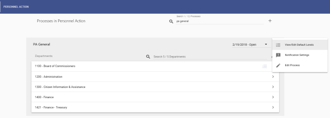 To view or edit default approval levels, manage notifications or edit an approval process, click the Actions menu icon