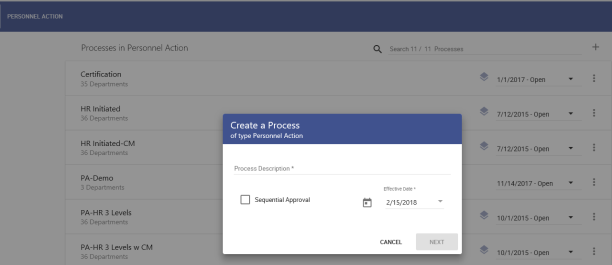 Create a Process dialog opens, asking for a description of the process, whether approvals will be sequential and the date the process becomes effective. -