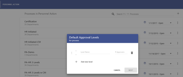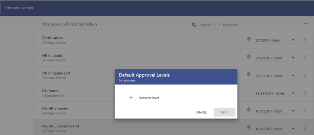 Default Approval Levels dialog.Note: The Default Approval Levels function lets you set up departments with default and custom approval levels.