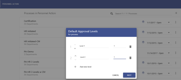 dialog expands to include a field for the name of the first level and the number of approvers at that level. -