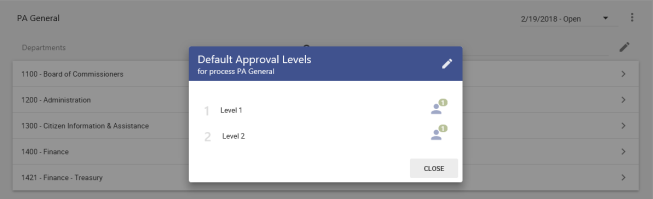 Default Approval Levels dialog in view mode. To edit the levels, click the pencil icon
