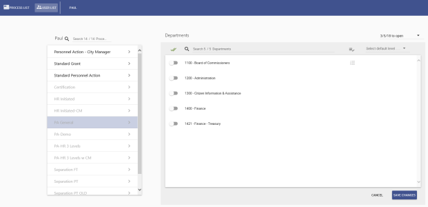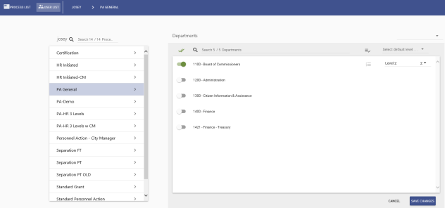select the departments you want to associate with the approval process. By default, each department you select is associated with the same approval levels. -