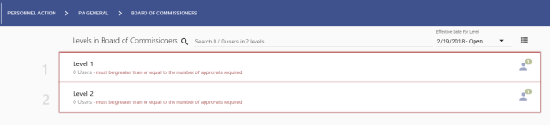 Approval levels display as individual cards containing the message that the number of users must be equal to or greater than the number of approvals required. The user icon