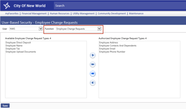 To authorize an employee to a change request type, select it in the Available list box and move it to the Authorized list box.