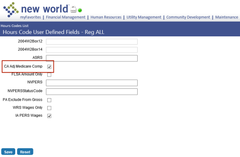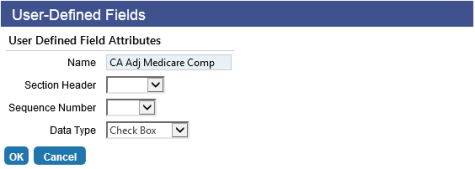Click the User-Defined Fields button at the bottom of the page. The Hours Code User-Defined Fields page displays with the CA Adj Medicare Comp check box available for selection: