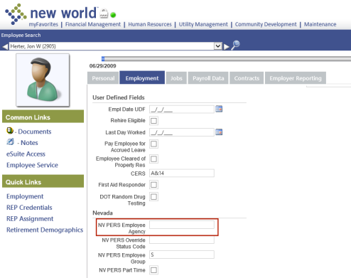 A new Workforce Employment user-defined field (UDF), NV PERS Employee Agency, will be used to identify employees who are in agencies different from the one specified in the Agency Number field. To set up and use this field, follow these steps: