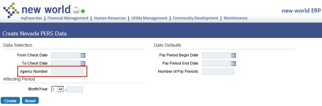 Note: Due to the addition of the agency number to the create data process, the Reporting Agency Number field has been removed from the Nevada PERS Report page.
