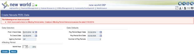 Each time the Create Nevada PERS Data process is run, a row containing the affected reporting period, check date range and pay period date range will be added to the grid on this page.