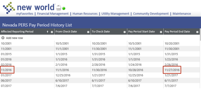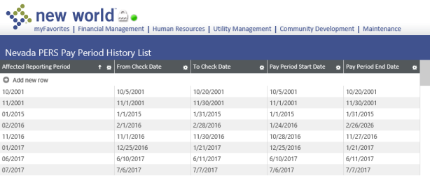 Nevada PERS Pay Period History has been added to the Nevada State Requirements menu to allow the viewing and, if necessary, correction of past reporting periods.