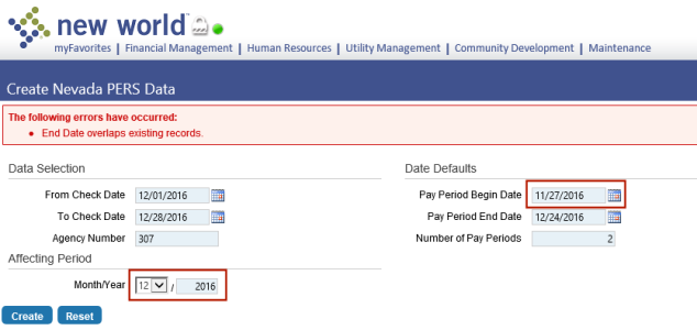 This error occurs because pay period dates overlap. The date 11/27/2016 is being reported in period 12/2016 on the Create Nevada PERS Data page and in period 11/2016 on the