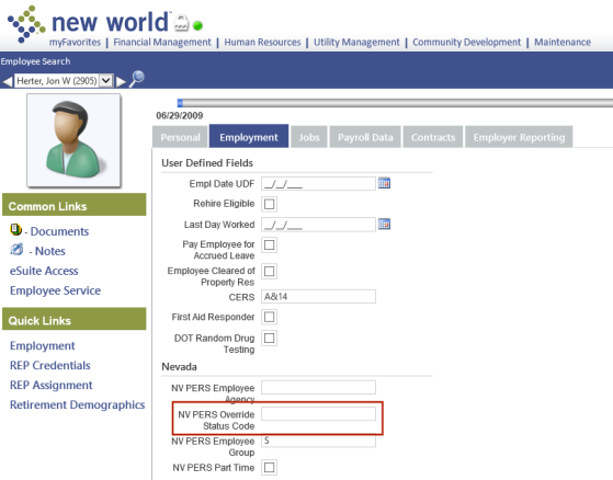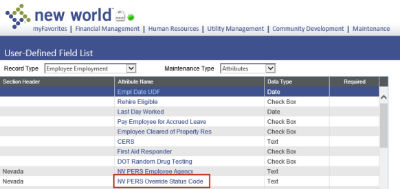 For employees who are ineligible for PERS and do not have deduction or benefit contributions but have wages subject to contributions, a new Workforce Employment UDF, NV PERS Override Status Code, will be used to allow ineligible employee wages to be reported. To set up and use this field, follow these steps:
