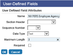 User-Defined Fields dialog will open. - In the Name field, type NV PERS Employee Agency.