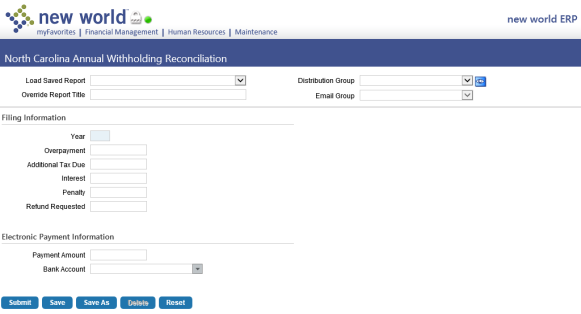 Annual Withholding Reconciliation option has been added to the North Carolina State Requirements menu. Use this option to generate the North Carolina Annual Withholding Reconciliation reports and transmittal file.