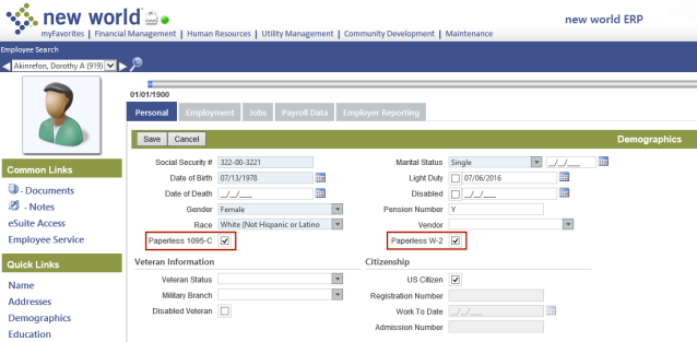 Paperless W-2 and Paperless 1095-C check boxes have been added to the Demographics section of the employee's Workforce Administration Personal tab.