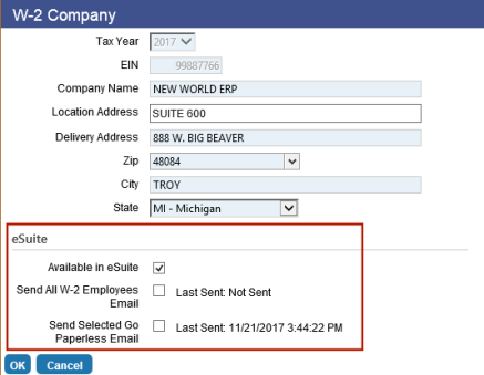W-2 Company dialog. The Available in eSuite check box has been moved to this section, and the following two check boxes have been added: Send All W-2 Employees Email and Send Selected Go Paperless Email.