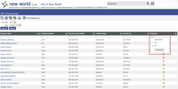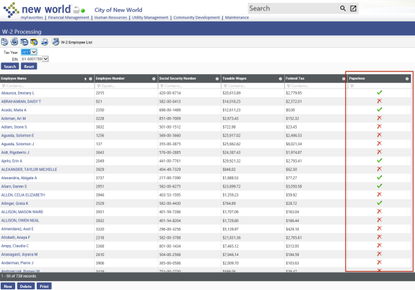 W-2 Employee List grid to identify employees who are receiving W-2s electronically and those who are not.