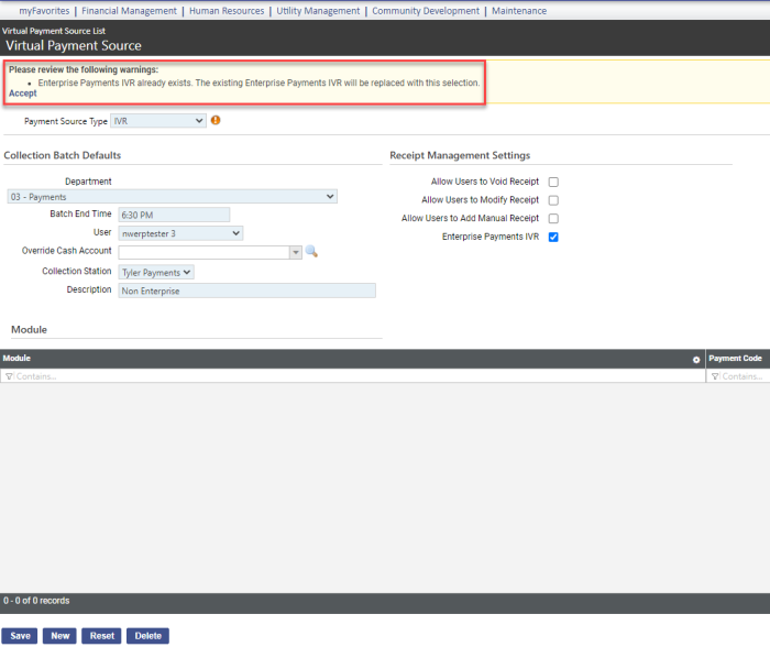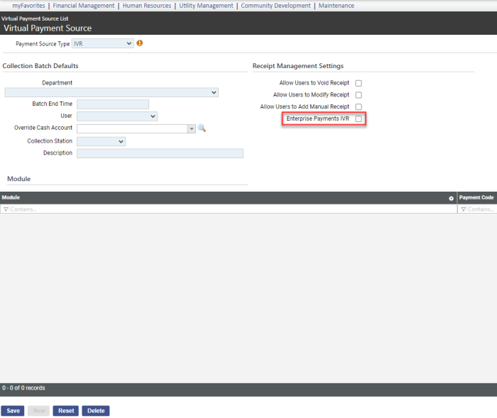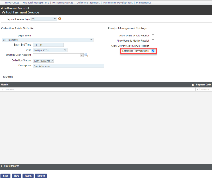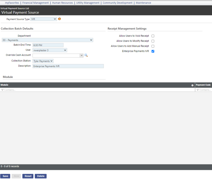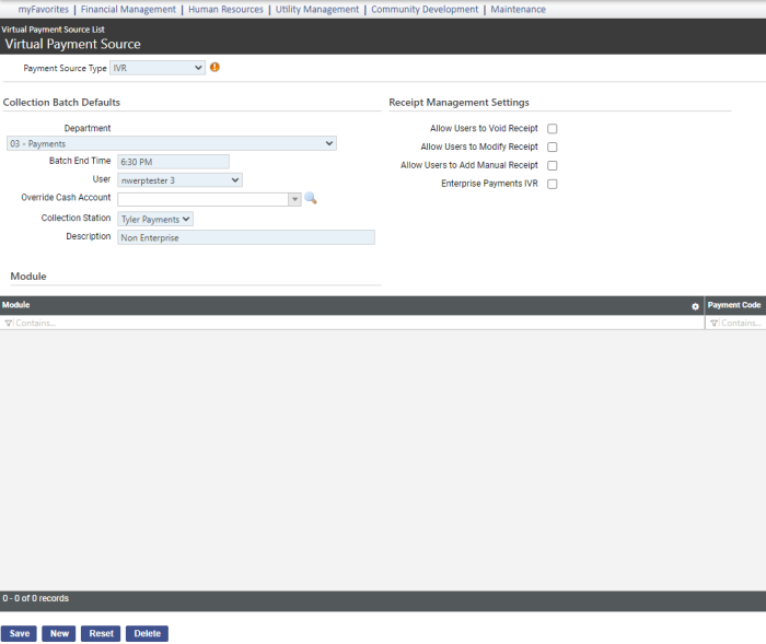 Maintenance > new world ERP Suite > Revenue Collection > Virtual Payment Source
