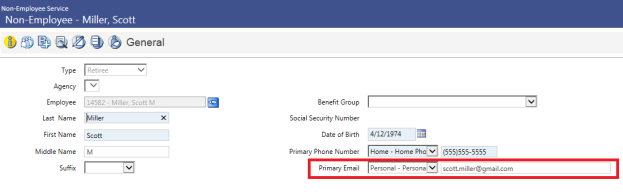 The email address field for non-employees is in new world ERP > Human Resources > Non-Employee > Non-Employee Service. Search and select the non-employee. The General screen contains the email address field: