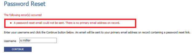 When the user selects Reset Password and the eSuite user does not have a primary email set up in new world ERP, the following message will display: “A password reset email could not be sent. There is no primary email address on record”: