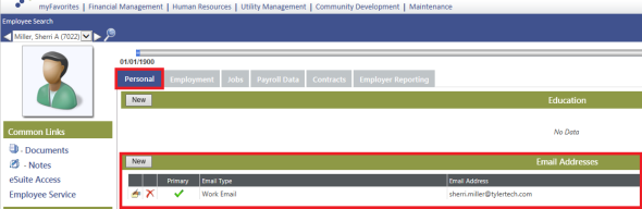 The email address field for employees is in new world ERP > Human Resources > Workforce Administration > search for the employee > select their employee number. The Personal tab contains the email address section: