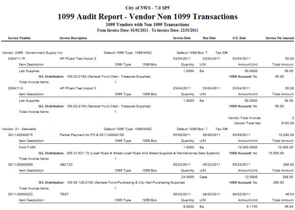 The 1099 Register page shows all the transactions for each 1099 vendor, sub-totaled by vendor. All transactions are listed in this report, which includes transactions for vendors that did not exceed the minimum amount required to print a 1099. This report allows you to verify the inclusion of all valid 1099 transactions and also the exclusion of non-1099 transactions.