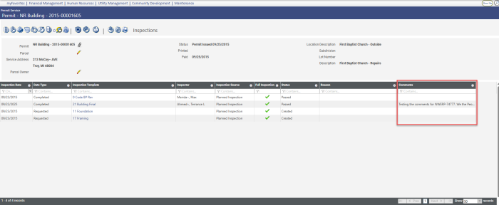 Community Development > Permits > Permit Service > Permit Edit > Inspections