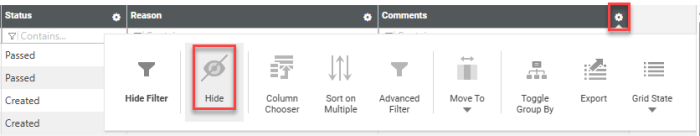 To hide the column, click the Feature chooser icon in the column header, then Hide: