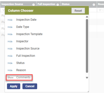 The Column Chooser window displays. Select Show Comments and click Apply:
