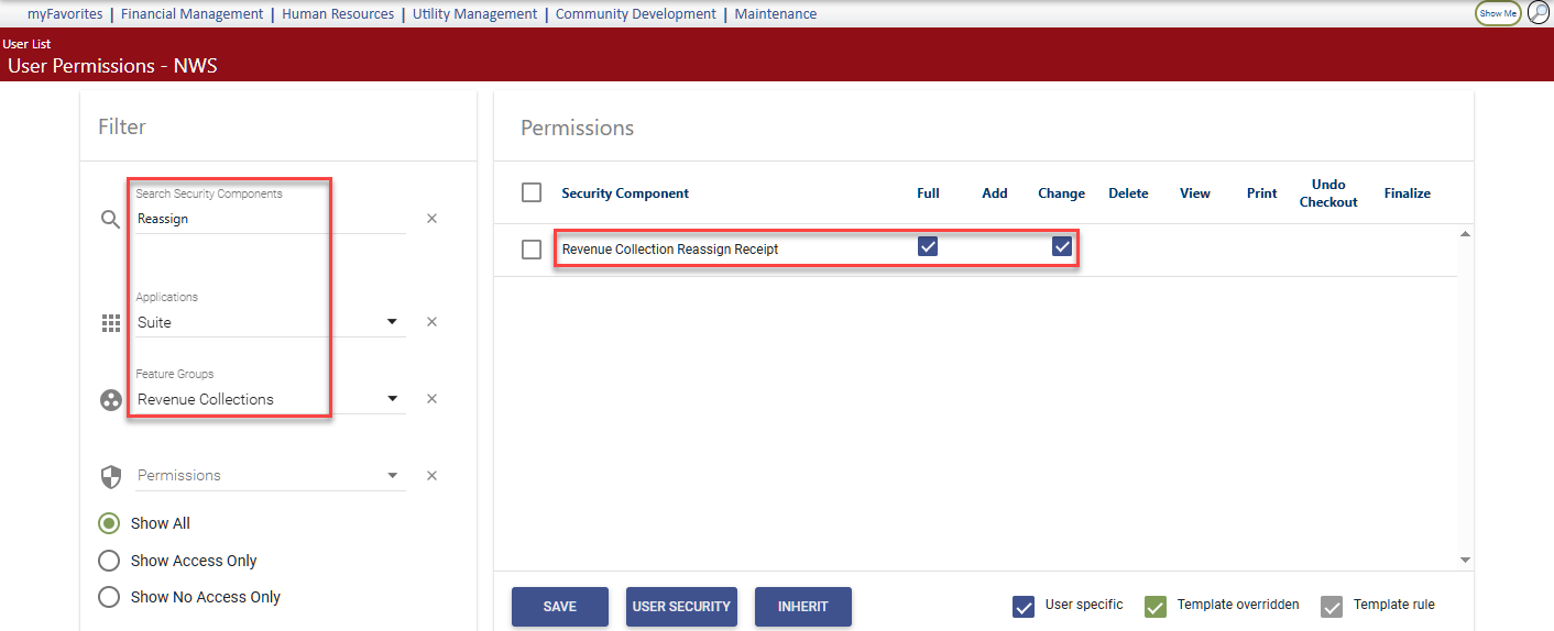 For the Reassign button to display on a user's Revenue Collection Batch page, the user needs permission to the Revenue Collection Reassign Receipt security component: