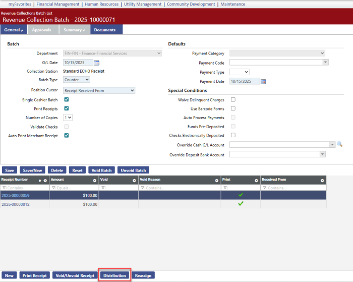 Financial Management > Revenue Collections > Receipts > Batch Number