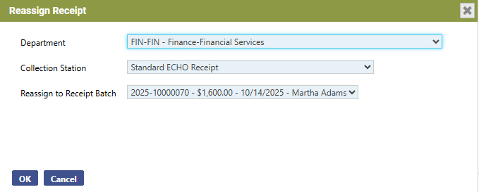 - Select the Reassign to Receipt Batch. The dropdown contains all the open receipt batches that are on the receipt batch list. The selection displays the number of the target receipt batch, the total receipt amount, the G/L date and the cashier.