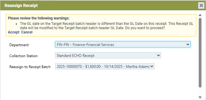 - To proceed with the reassign process, click Accept; to exit the process, click Cancel. Clicking Accept removes the receipt from the receipts grid on the General tab and adds it to the target receipt batch grid.