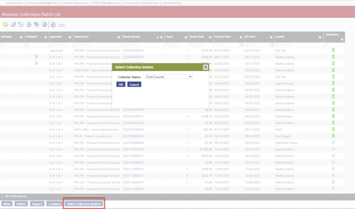 The new Select Collection Station button on the Revenue Collection Batch List page lets you change collection stations without having to log out and log in: