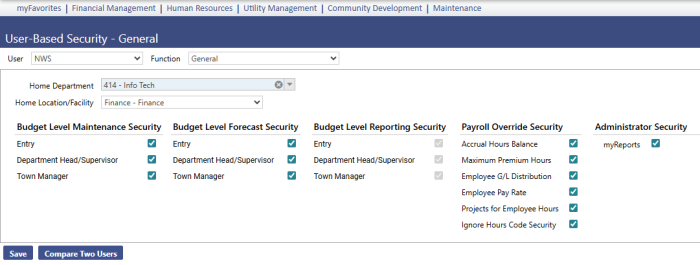 In User-Based Security, there are security settings that allow authorized users to determine the budget levels at which users can enter budget information, use the long-range forecasting feature, and view and generate reports. Go to Maintenance > new world ERP Suite > Security > User-Based Security. ClosedShow me.