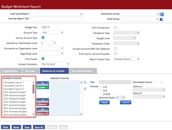 When you run the report, the Balances to Include tab allows you to choose the columns that are included on the report. The list includes the new columns that are now available as part of Biennial Budgeting and Long-Range Forecasting. Only 8 columns of data can fit on the report when you print it. If the report is exported to Excel (using the Create Microsoft Excel File option), you can view all of the columns you selected. ClosedShow me.