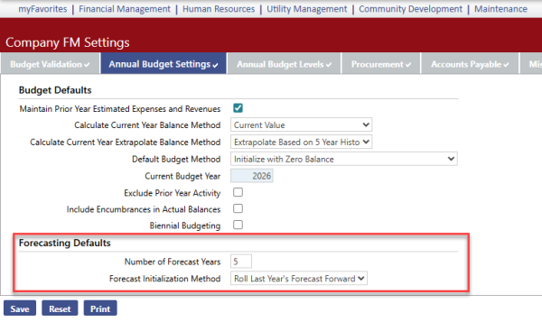 In Company FM Settings (Maintenance > Financial Management > Company FM Settings), use the Annual Budget Settings tab to choose the number of years to forecast and the initialization method to use in the Forecasting Defaults section. ClosedShow me.