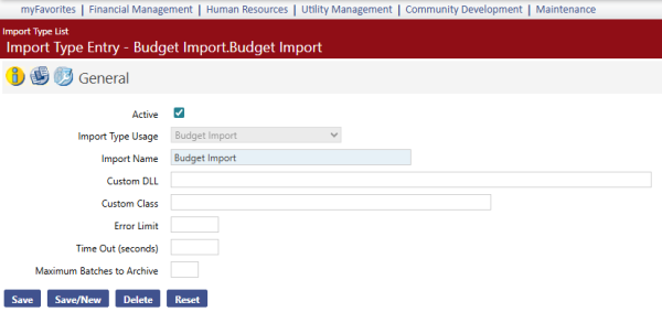Financial Management > Annual Budget Processing > Budget Processing > Budget Maintenance > Import button