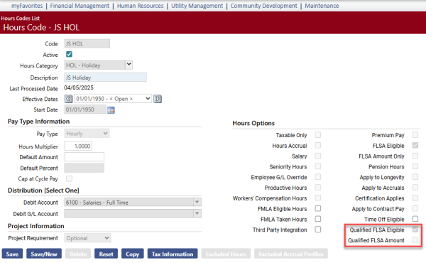 To accommodate this calculation, two checkboxes, Qualified FLSA Eligible and Qualified FLSA Amount, have been added to the Hours Code page: